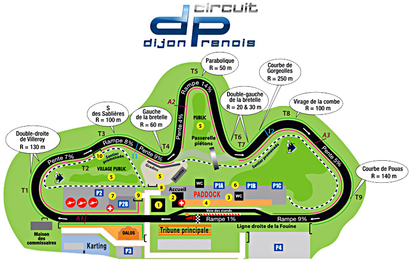 e Circuit de Dijon-Prenois est un célèbre circuit automobile situé en Bourgogne, en France. Il mesure 3,801 km de long et compte 8 virages, avec une grande variété de courbes, et de dénivelé, ce qui en fait l’un des circuits les plus techniques, et le plus rapide de France.